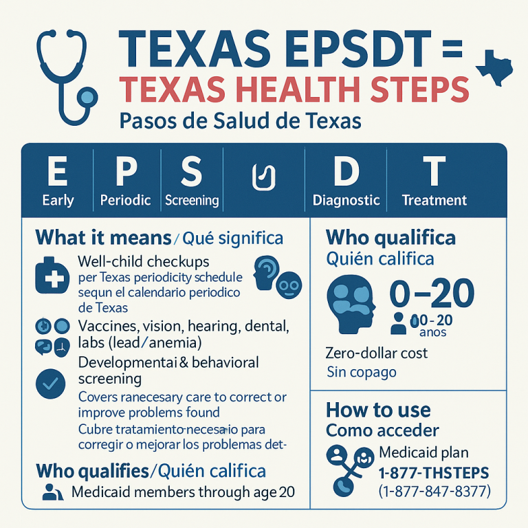Texas Health Steps (EPSDT) offers regular checkups, screenings, and preventive care, ensuring children on Medicaid grow healthy with early detection, treatment, and ongoing support.